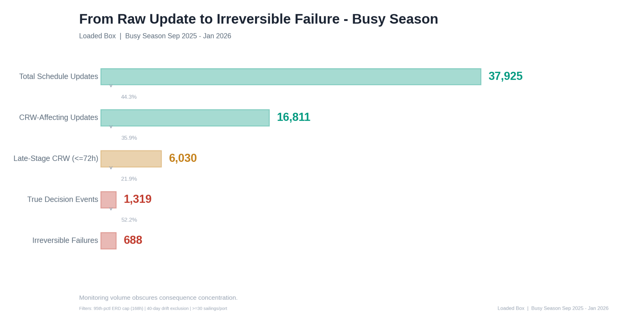 Caption: Most updates are noise. A small fraction drive consequence. Monitoring treats them the same.