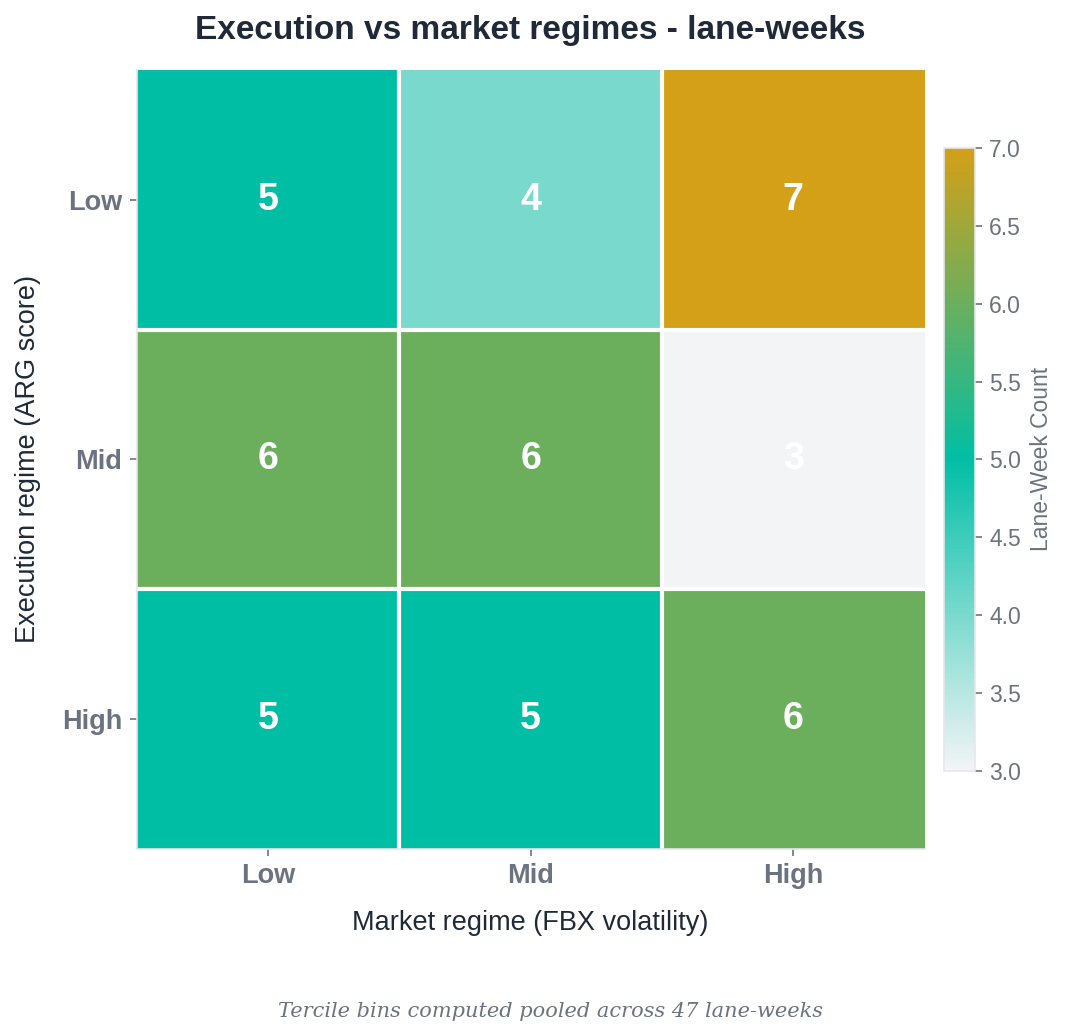 We then tested execution instability against three independent freight rate indices representing different pricing layers: