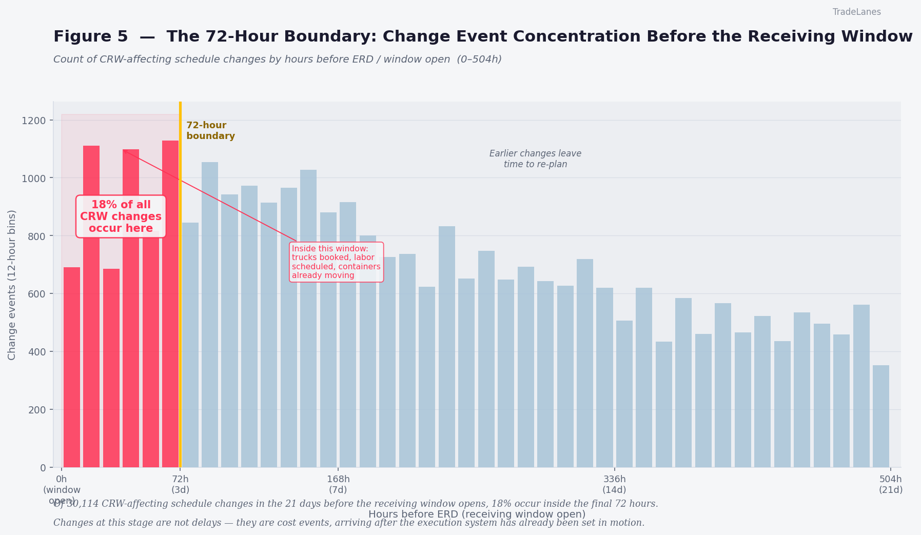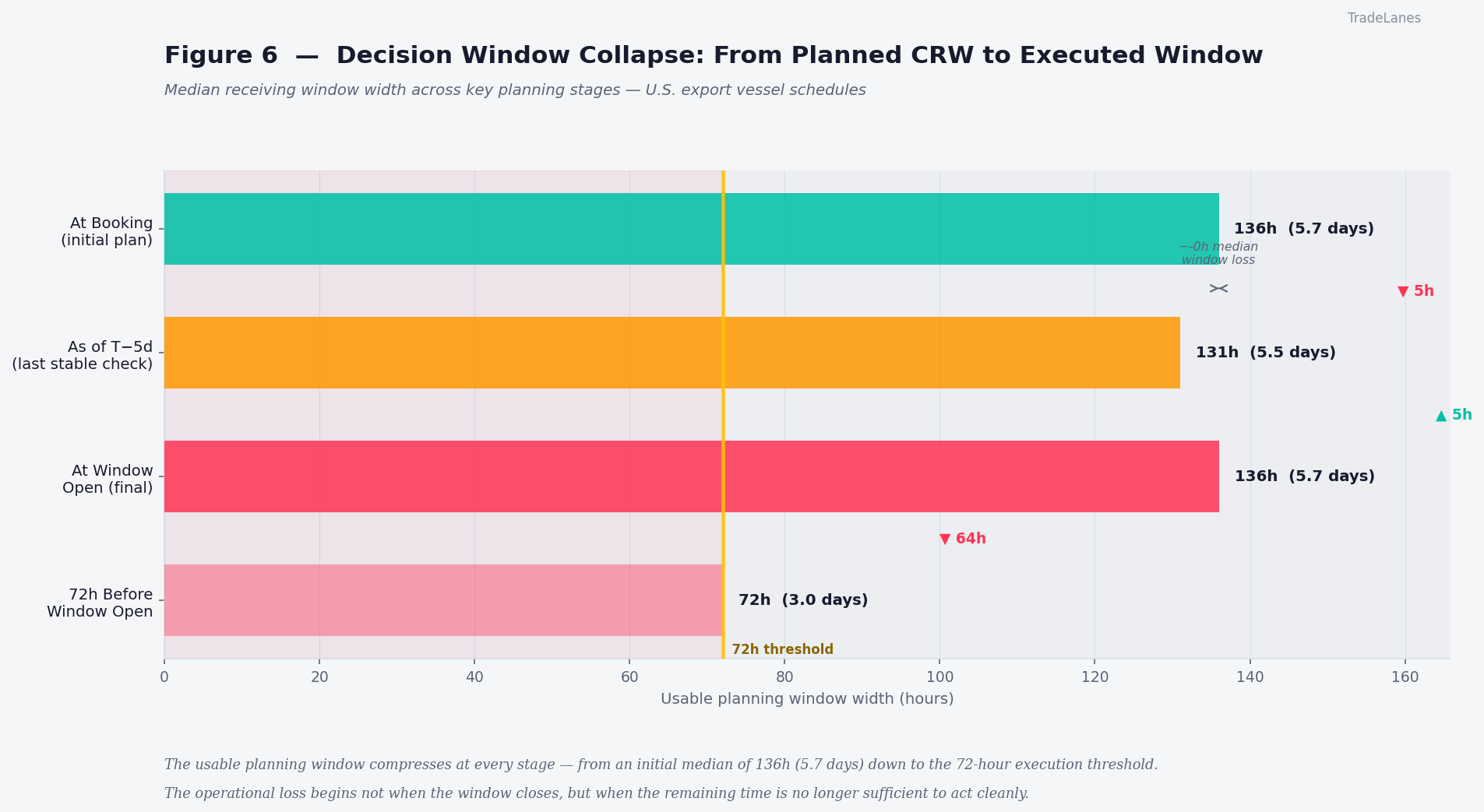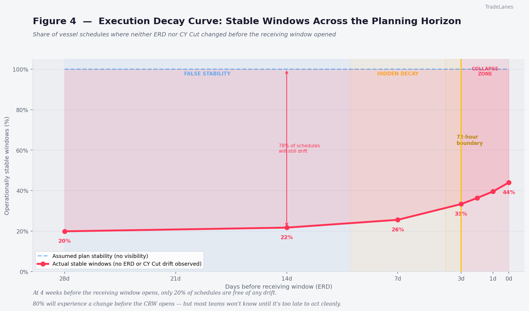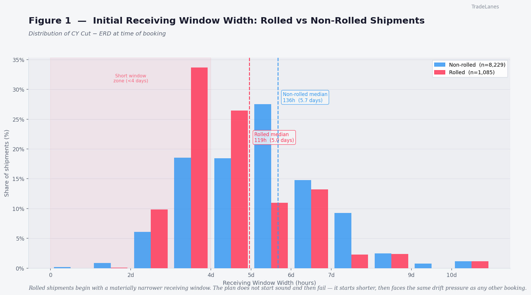 In our dataset of 5,000+ U.S. export departures, the majority of receiving windows will still shift after this point - often multiple times - before the window even opens.