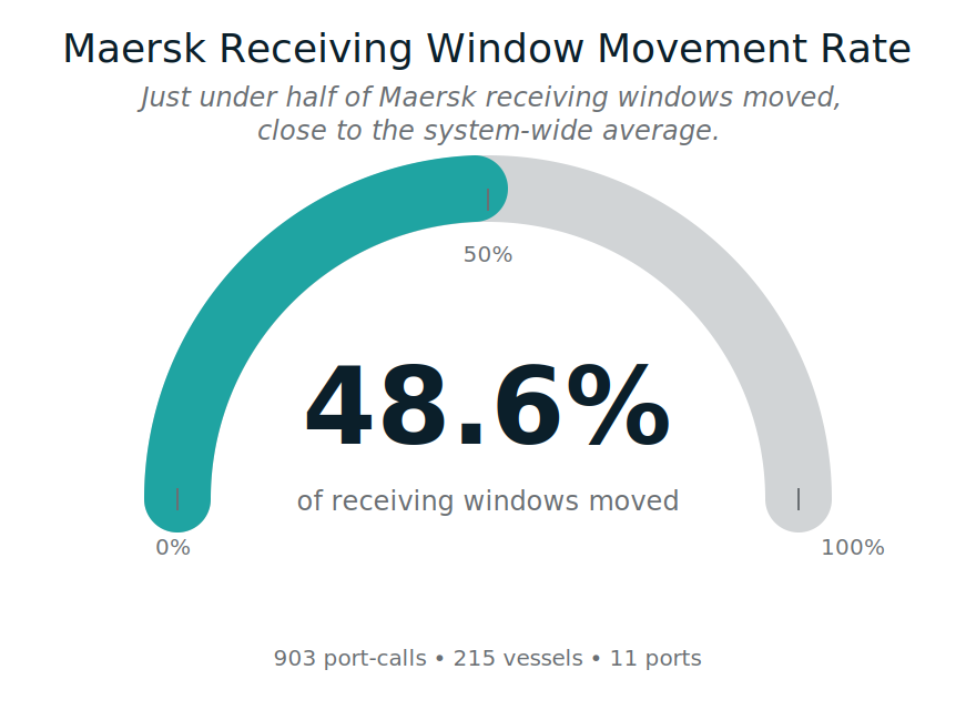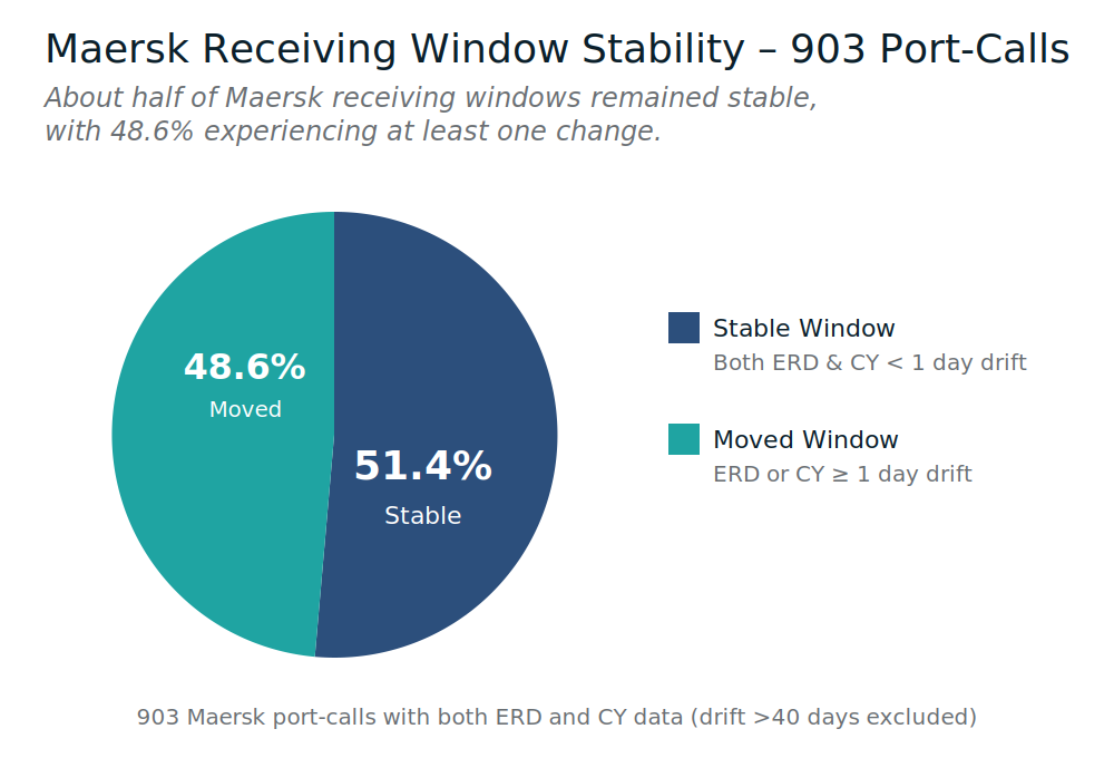 For Maersk, receiving-window stability is just over half of port-calls. That stability is real - but nearly half of shipments still experience execution-relevant change, which explains why exporters can feel friction even when arrival performance looks strong.