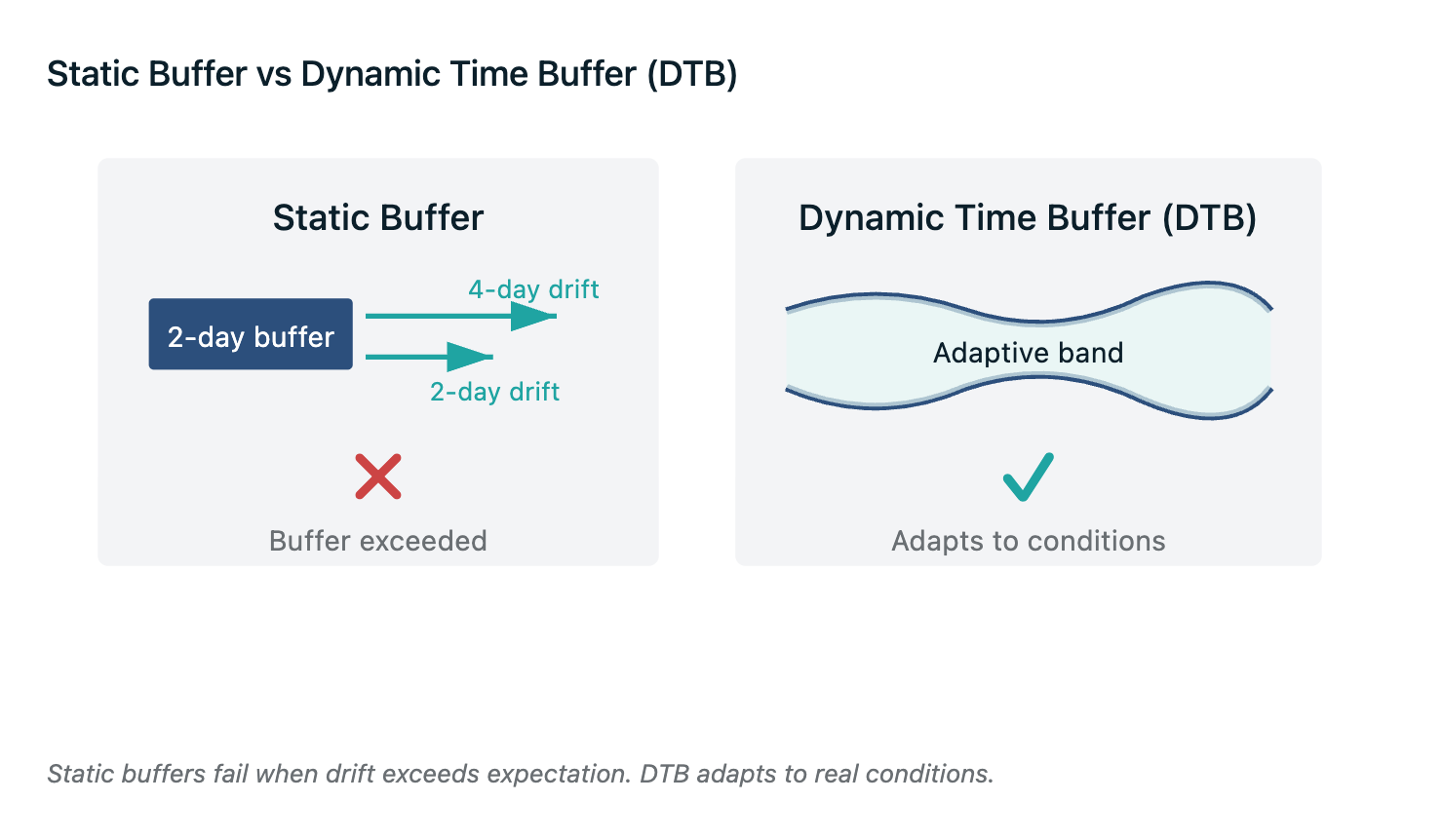 Shows: how a fixed buffer fails under multi-day drift; how DTB adapts.