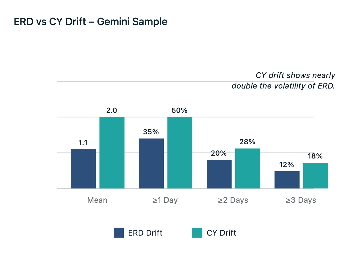 Shows: ERD mean vs CY mean; percentage in each drift band. Purpose: makes CY volatility visually undeniable.