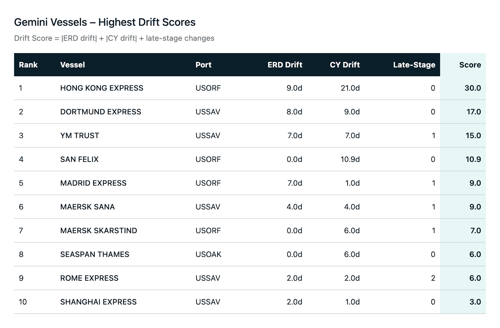 The top offenders included vessels posting CY drift of six, ten, and even twenty-one days. These are not rounding errors. These are planning failures that cascade down into documentation, drayage, and roll events.