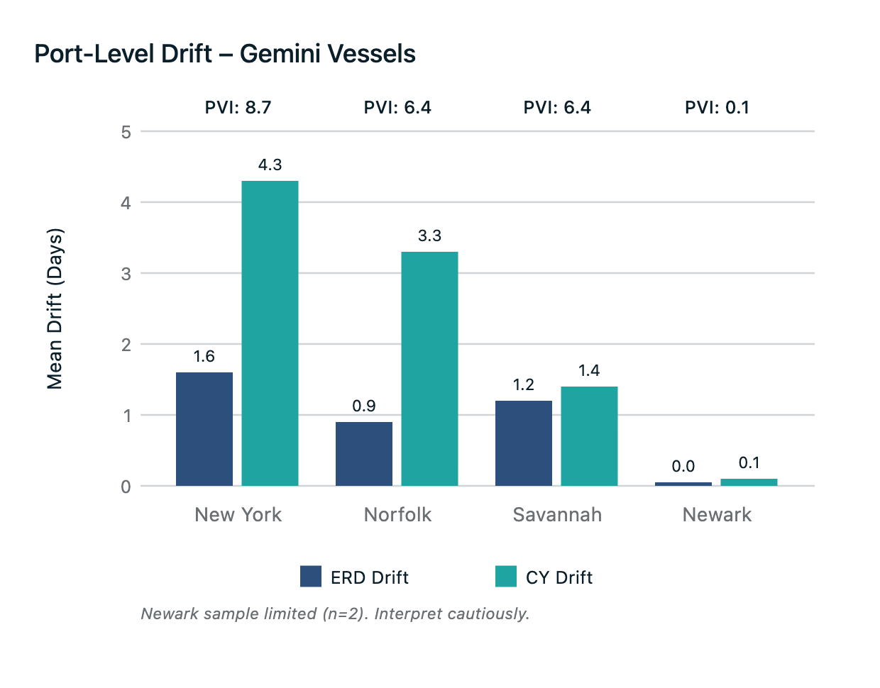 Shows: bar chart comparing ERD drift, CY drift, and PVI across Savannah, Norfolk, New York, and Newark. Purpose: communicates lane-specific volatility.