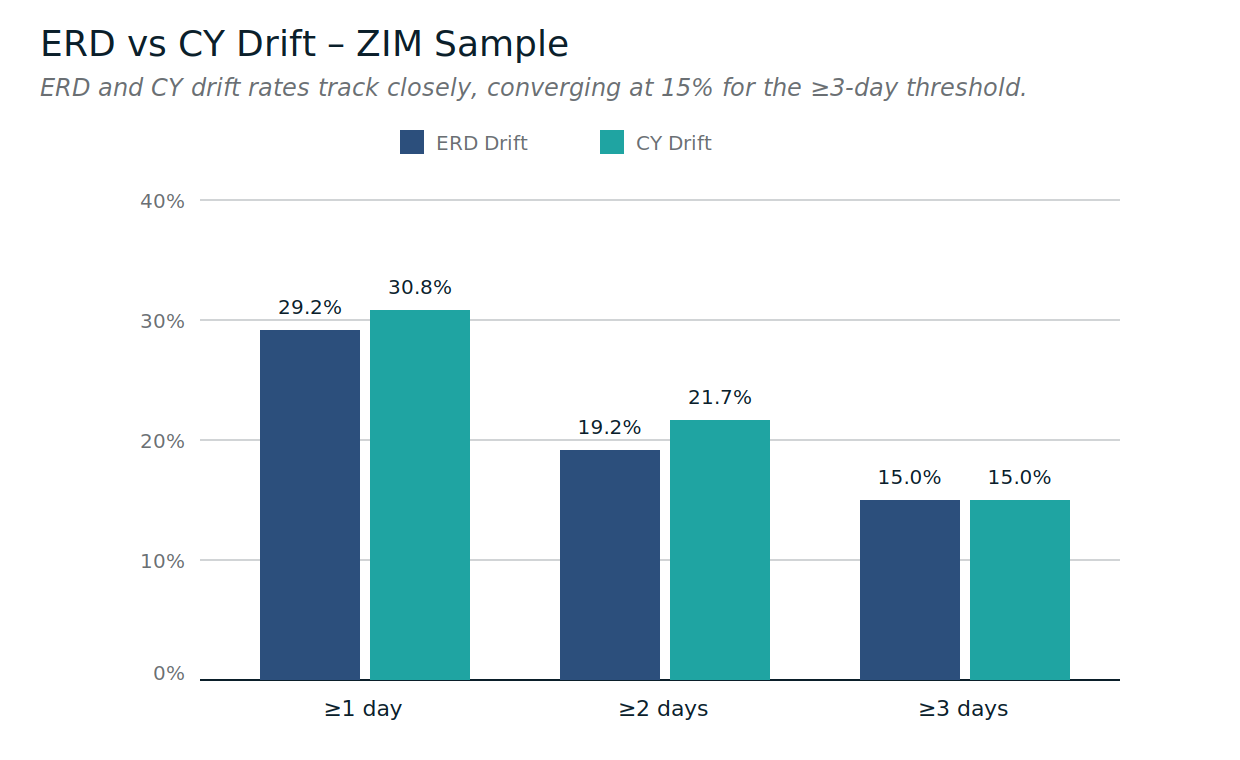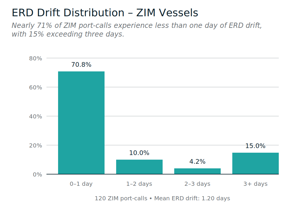Most ZIM ERD movement is small, but the tail still matters: 15% of port-calls experienced 3+ days of ERD drift.