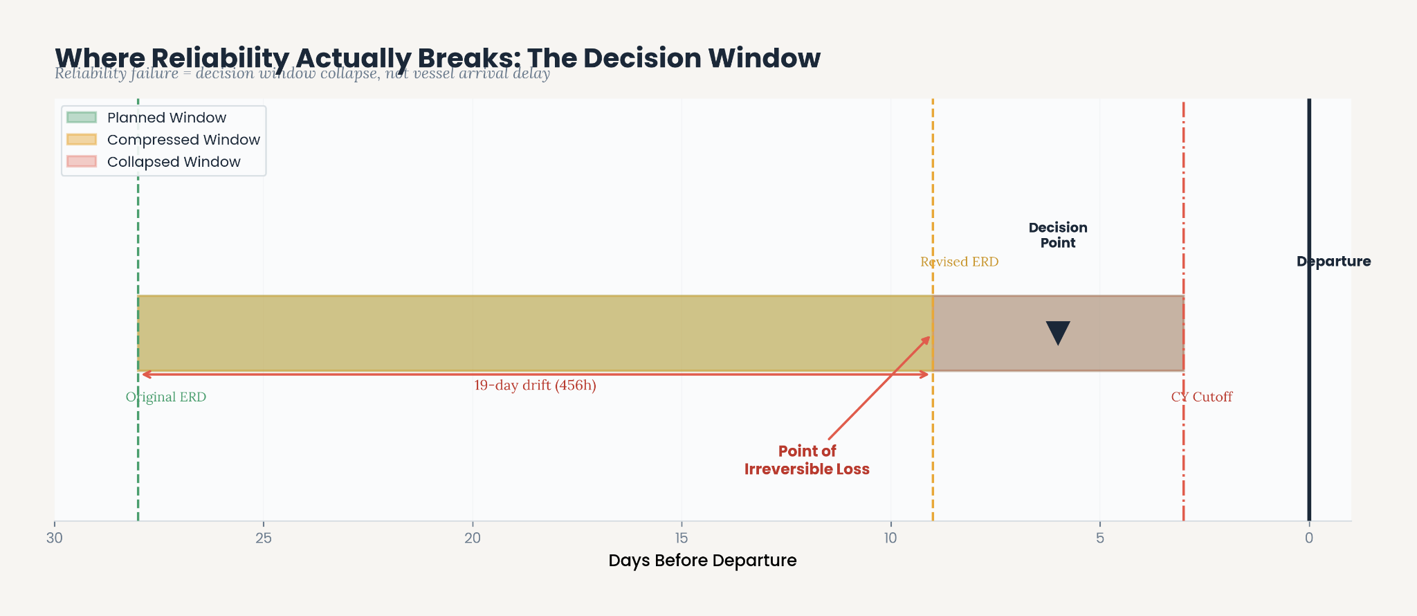 Figure 6. Reliability failure occurs when decision windows collapse - not when vessels arrive late. Schedule “accuracy” can appear acceptable even as operational recovery becomes impossible.