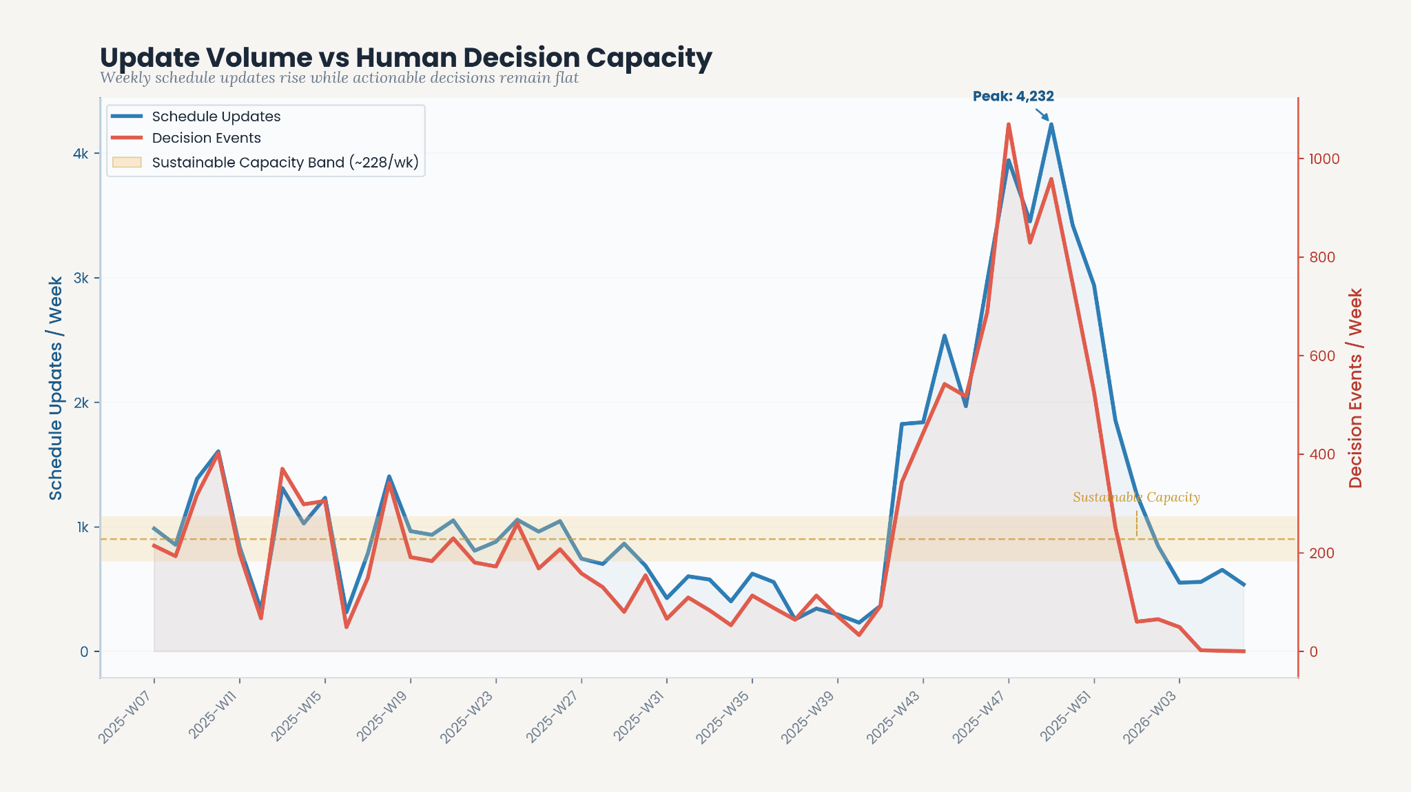 Figure 1. Schedule updates now arrive at a volume that exceeds human decision capacity. While update frequency continues to rise, the number of actions export teams can realistically take remains flat, forcing manual filtering and reactive decision-making.