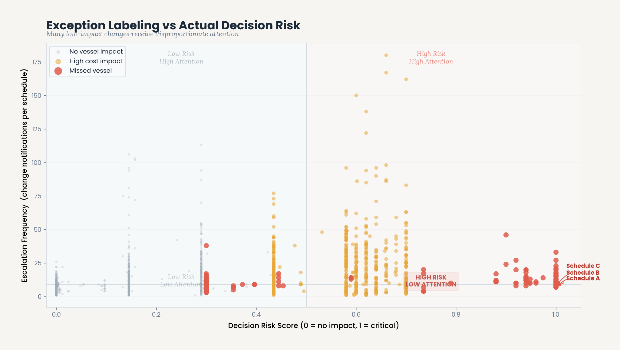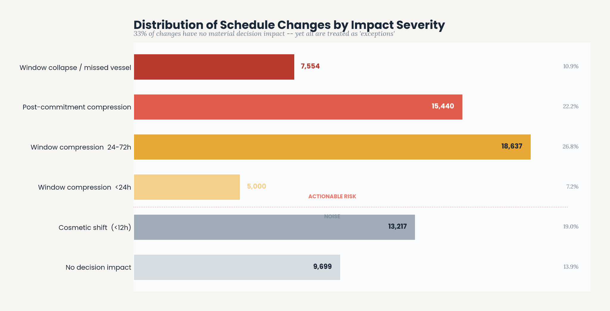 Figure 3. Most schedule changes do not materially affect exporter decisions. A small subset collapses decision windows and drives the majority of operational risk, yet all updates are commonly labeled and treated as “exceptions.”