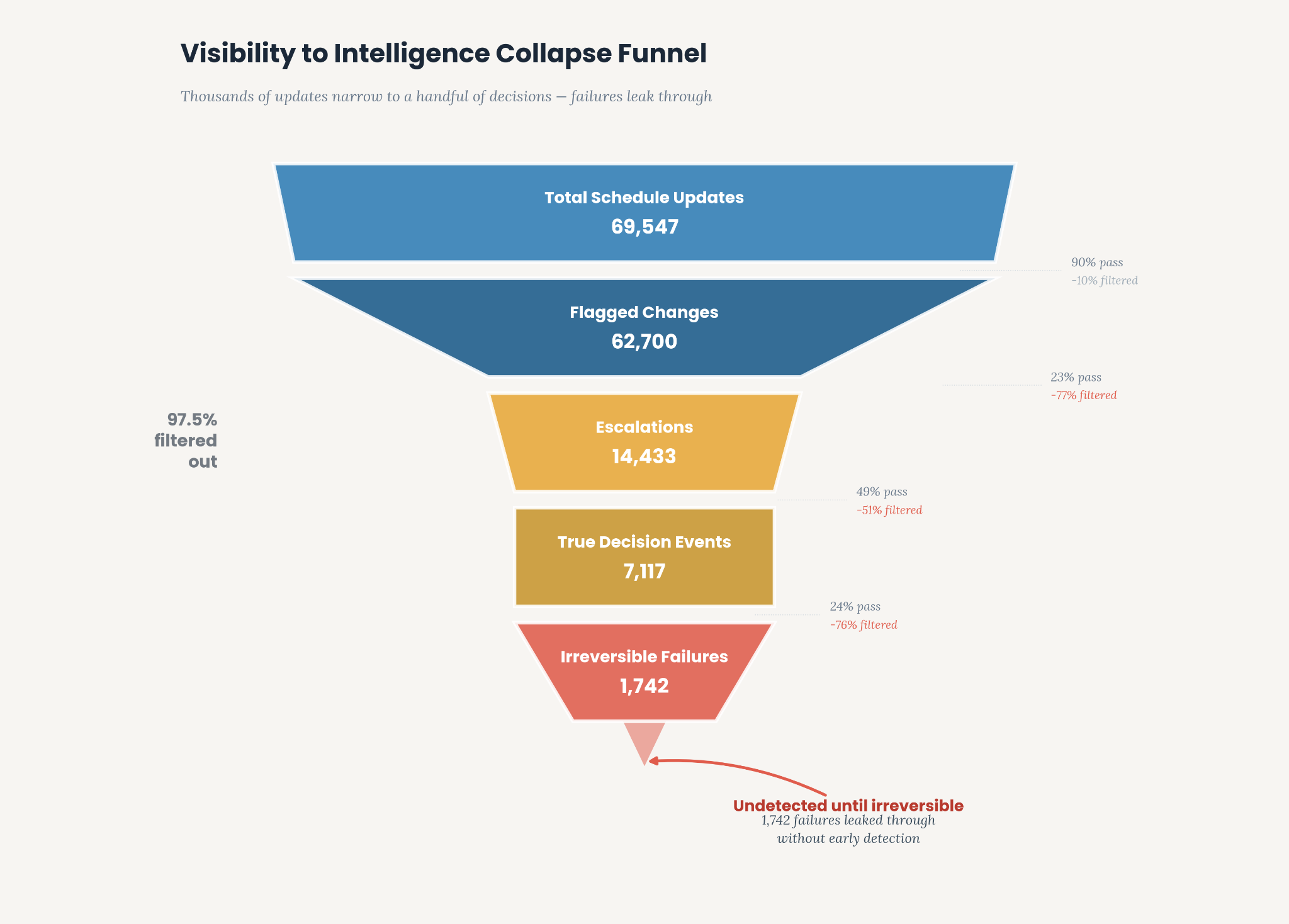 Figure 7. Visibility without intelligence collapses under scale. Thousands of updates narrow into a handful of real decisions, with irreversible failures leaking through when systems cannot distinguish signal from noise.