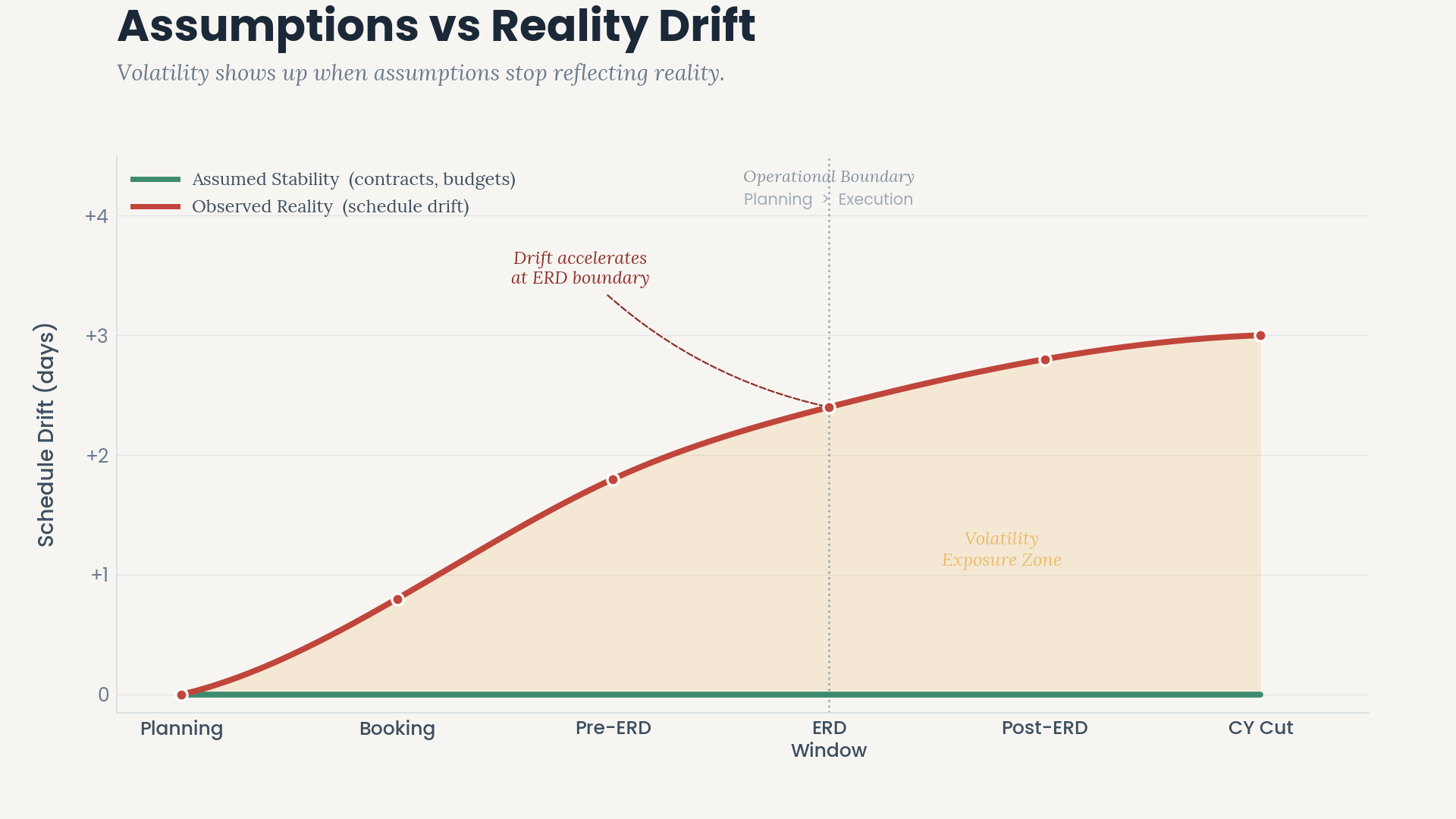 Figure 2. Volatility shows up when the original assumption stays flat while observed schedule drift accumulates across the shipment lifecycle. The gap widens most rapidly at the ERD boundary, where planning turns into execution.