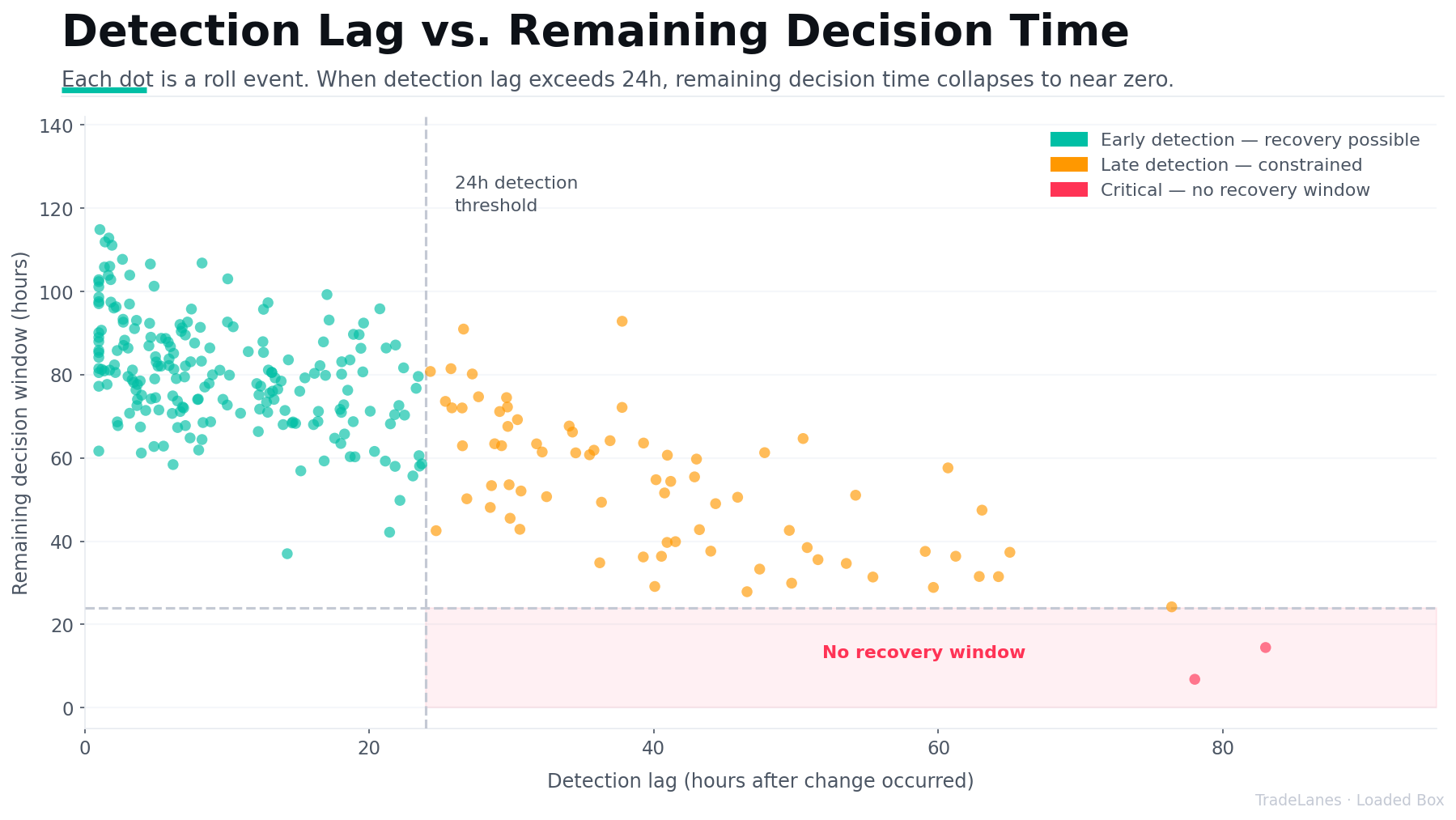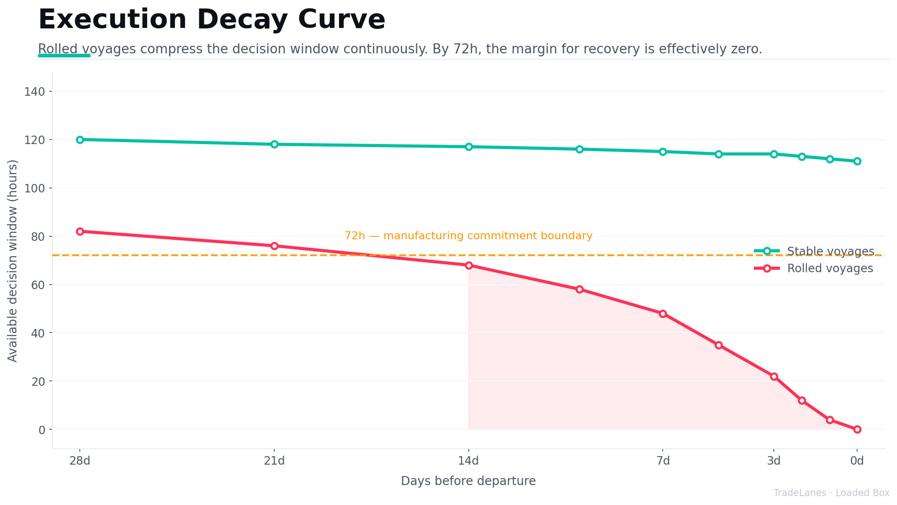 Executability declines gradually, then collapses as the system enters the final 72-hour window.